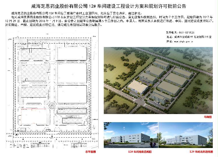 威海芝恩药业股份有限公司12#车间建设工程设计方案和规划许可批前公告